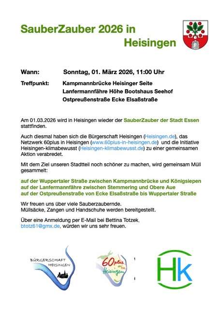 Am 01.03.2026 wird in Heisingen wieder der SauberZauber der Stadt Essen stattfinden. Auch diesmal haben sich die Bürgerschaft Heisingen (Heisingen.de), das Netzwerk 60plus in Heisingen (www.60plus-in-heisingen.de) und die Initiative Heisingen-klimabewusst (Heisingen-klimabewusst.de) zu einer gemeinsamen Aktion verabredet. Mit dem Ziel … Weiter